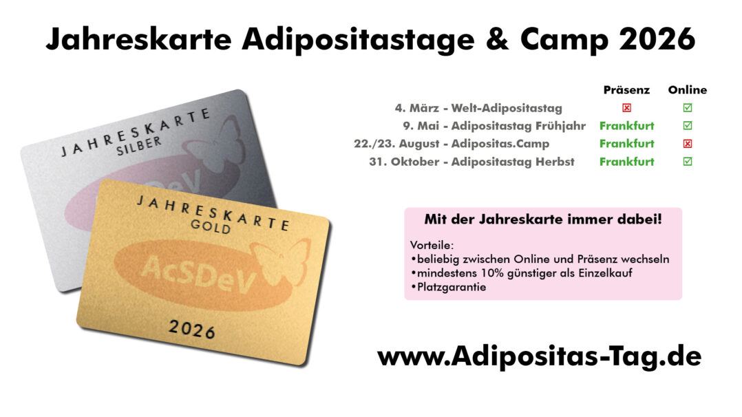 Wir haben für das Jahr 2026 unsere Jahreskarten Silber und Gold aufgewertet und das Adipositas.Camp mit eingeschlossen. Die 29 Euro fürs Camp schlagen sich mit nur 22 Euro Aufpreis bei der Jahreskarte nieder, man spart also 24% gegenüber der Einzelbuchung des Adipositas.Camps.